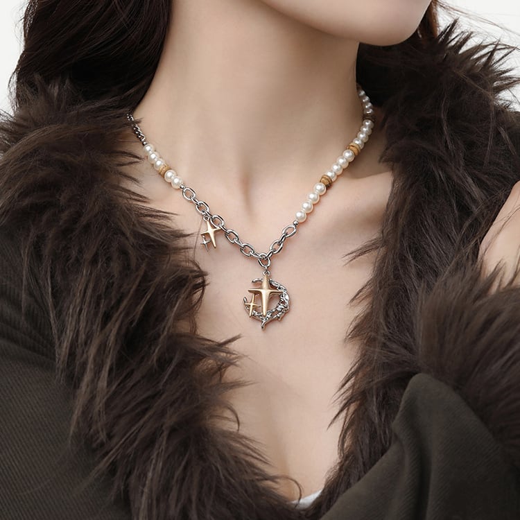 繊細なパールとチェーンが織りなすラインに月と星のモチーフがやさしく揺れ、静かな夜の輝きを胸元に添えます。