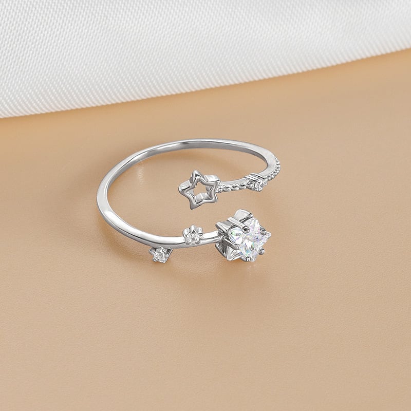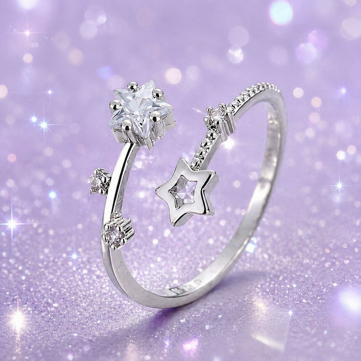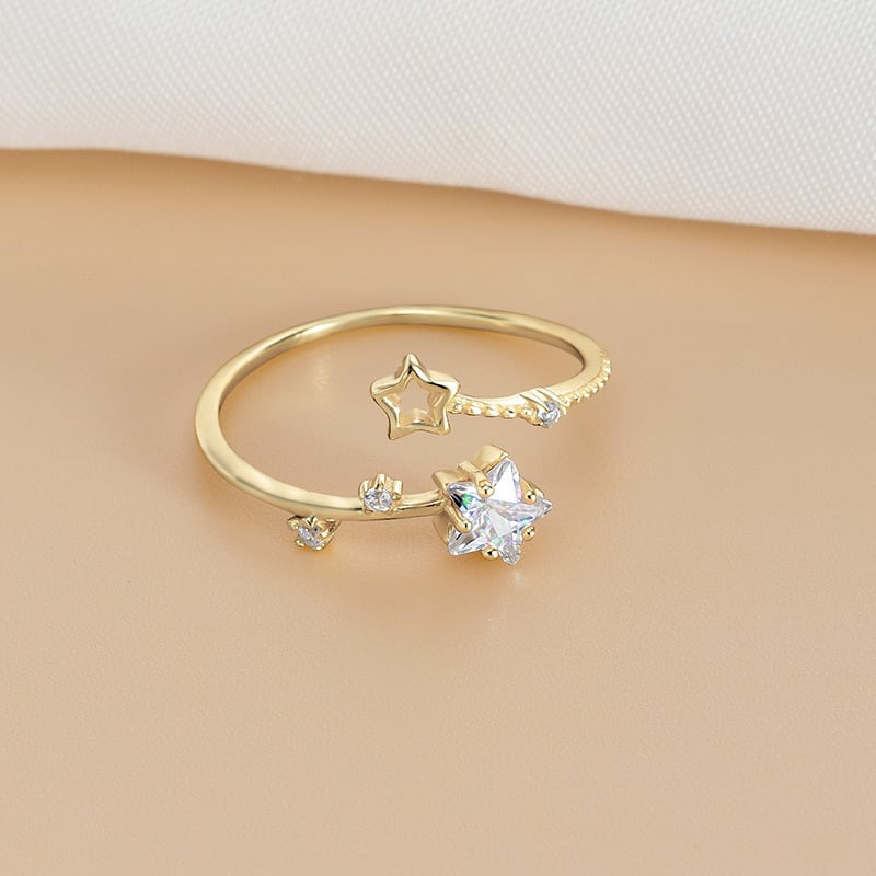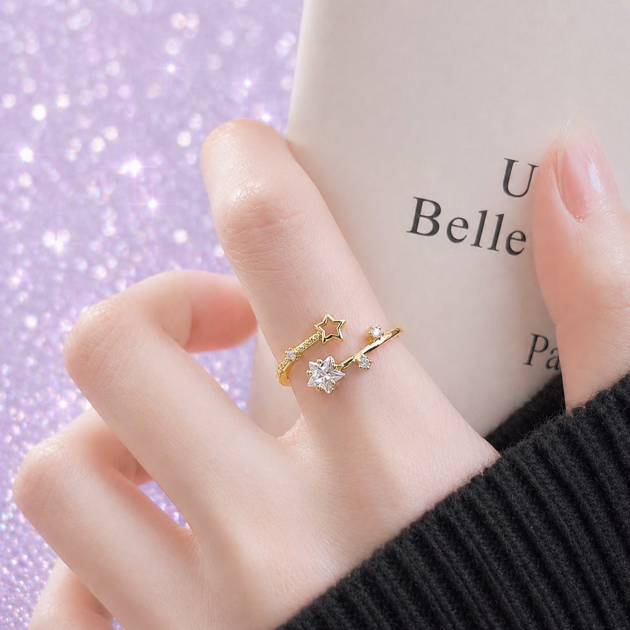 小さな星と澄んだ輝きを宿したビジューを組み合わせた、繊細でロマンティックなオープンリングです。