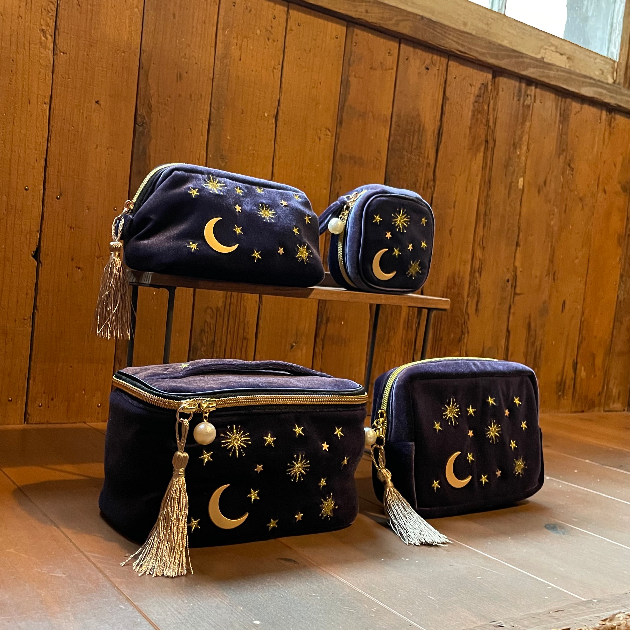 品のあるベルベット素材に星と月のパーツと金の糸の刺繍が施されたポーチです。