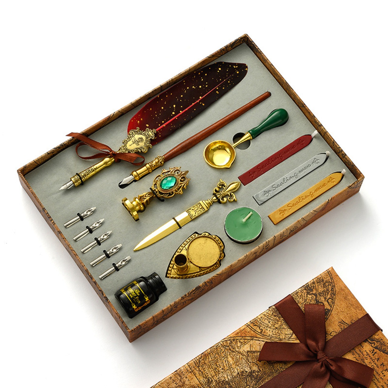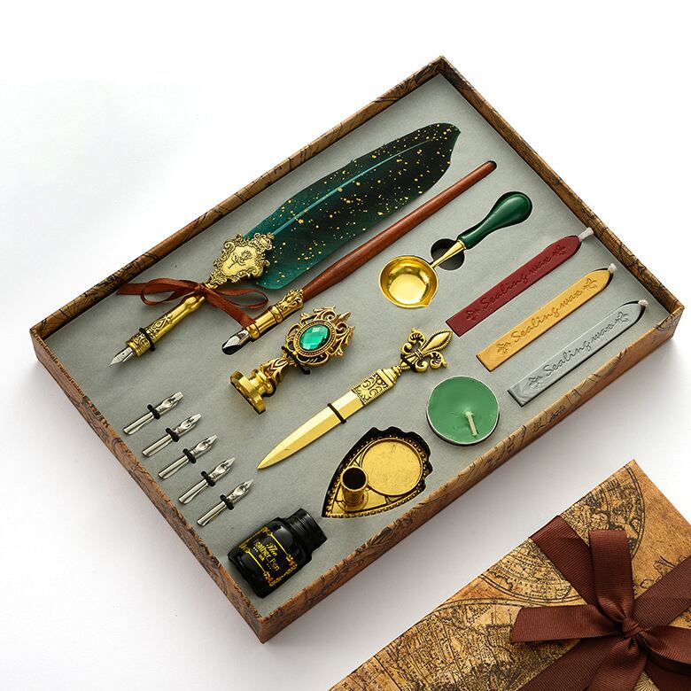羽根ペン、付けペン、替えペン先、インク、シーリングスタンプ、ロウソク、ペン立て、ペーパーナイフ