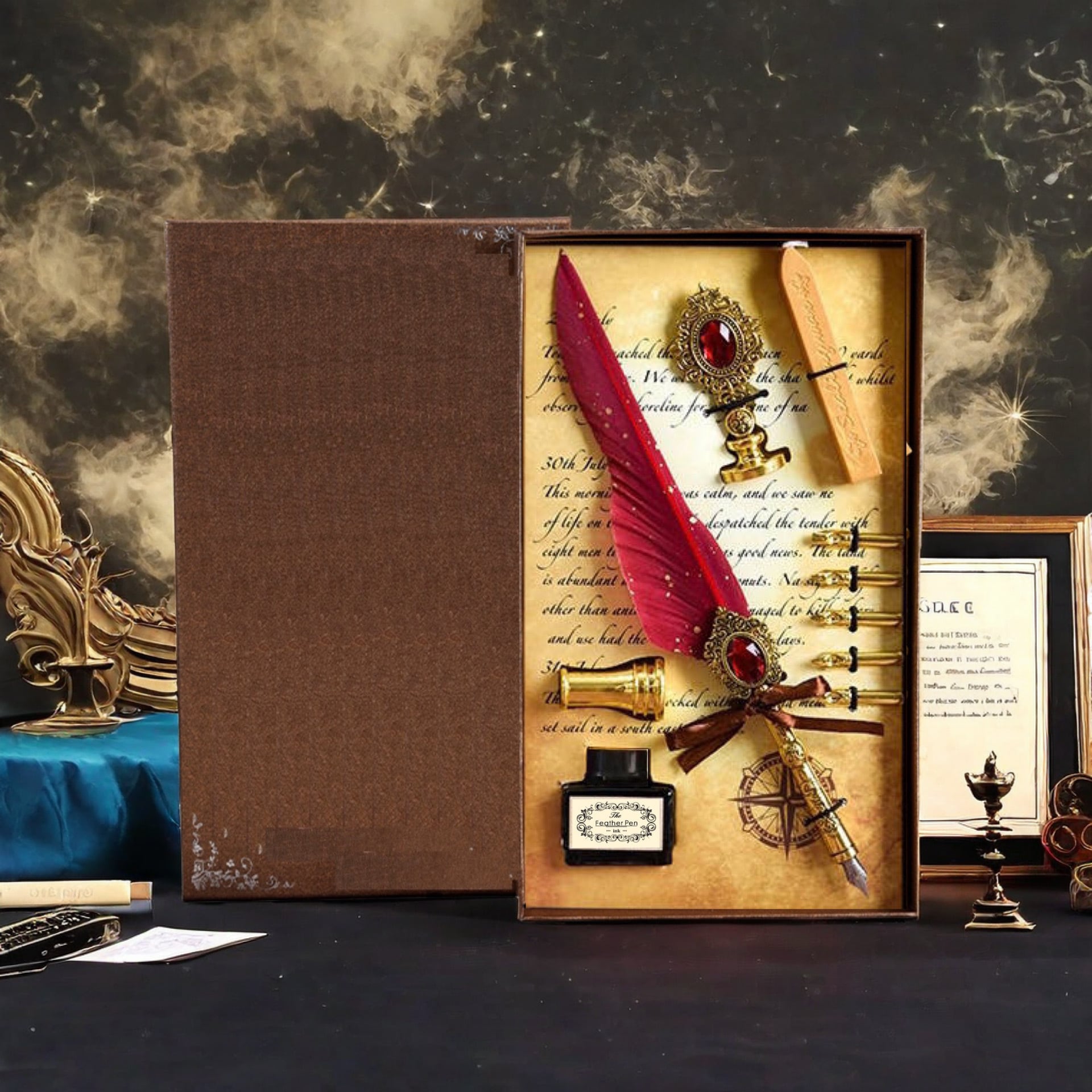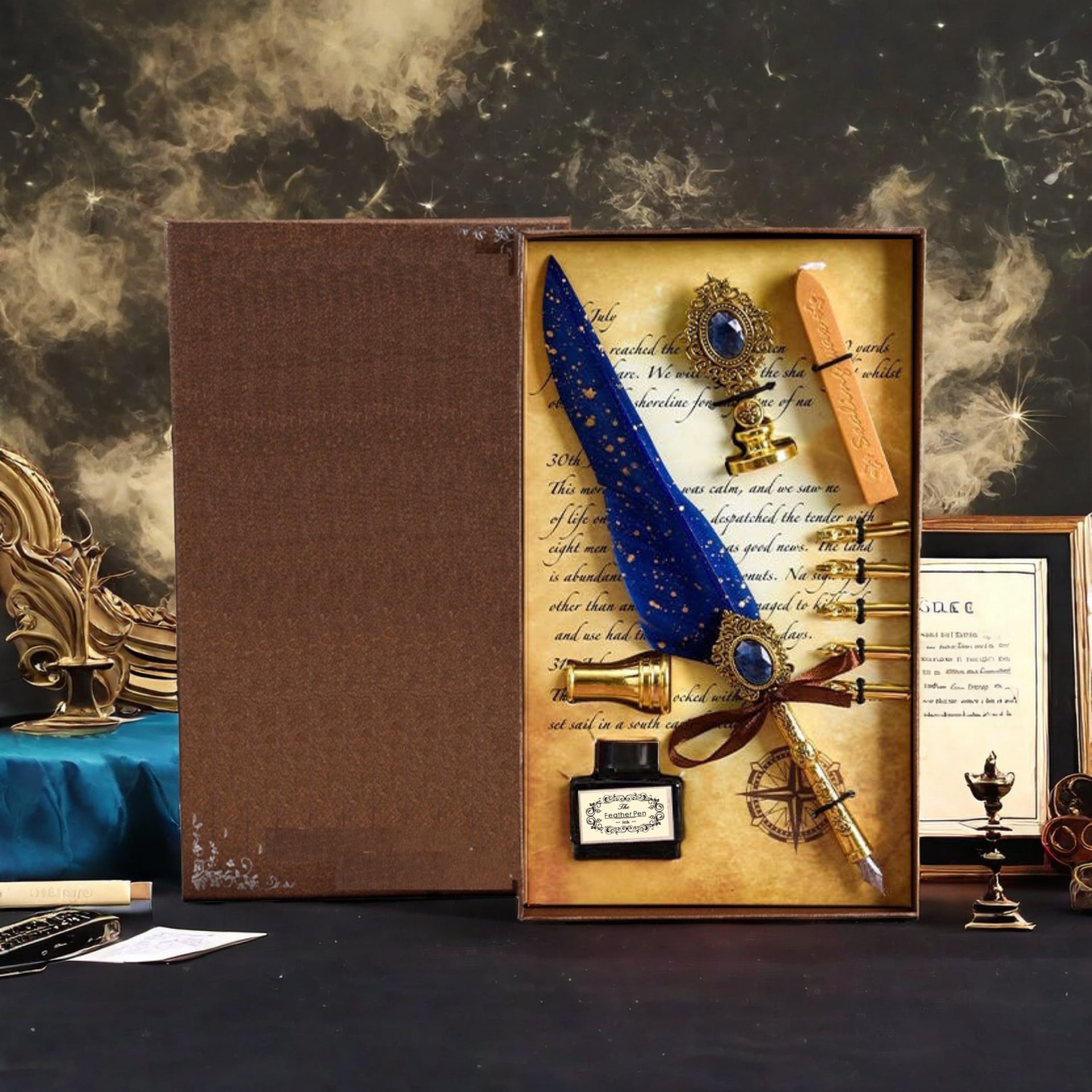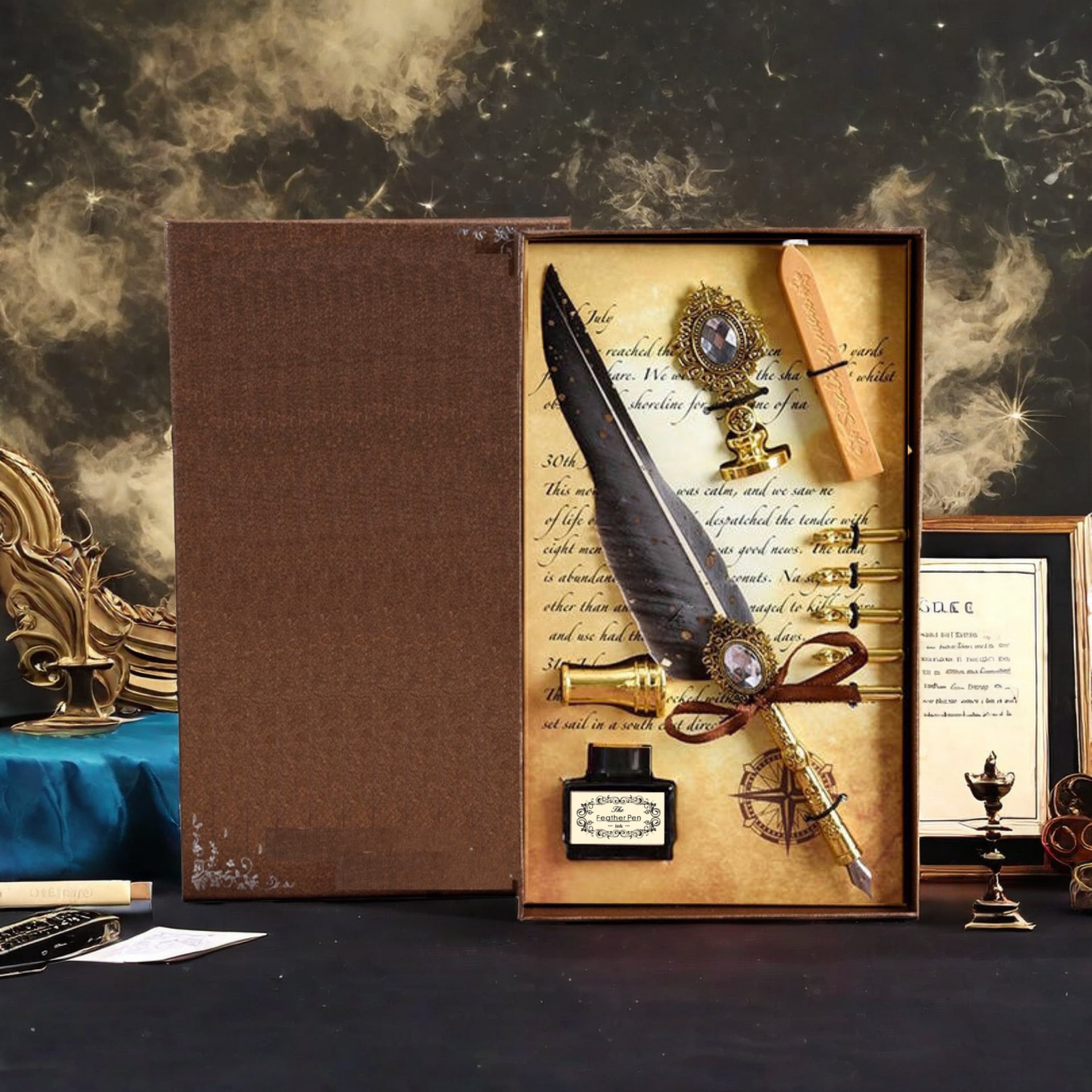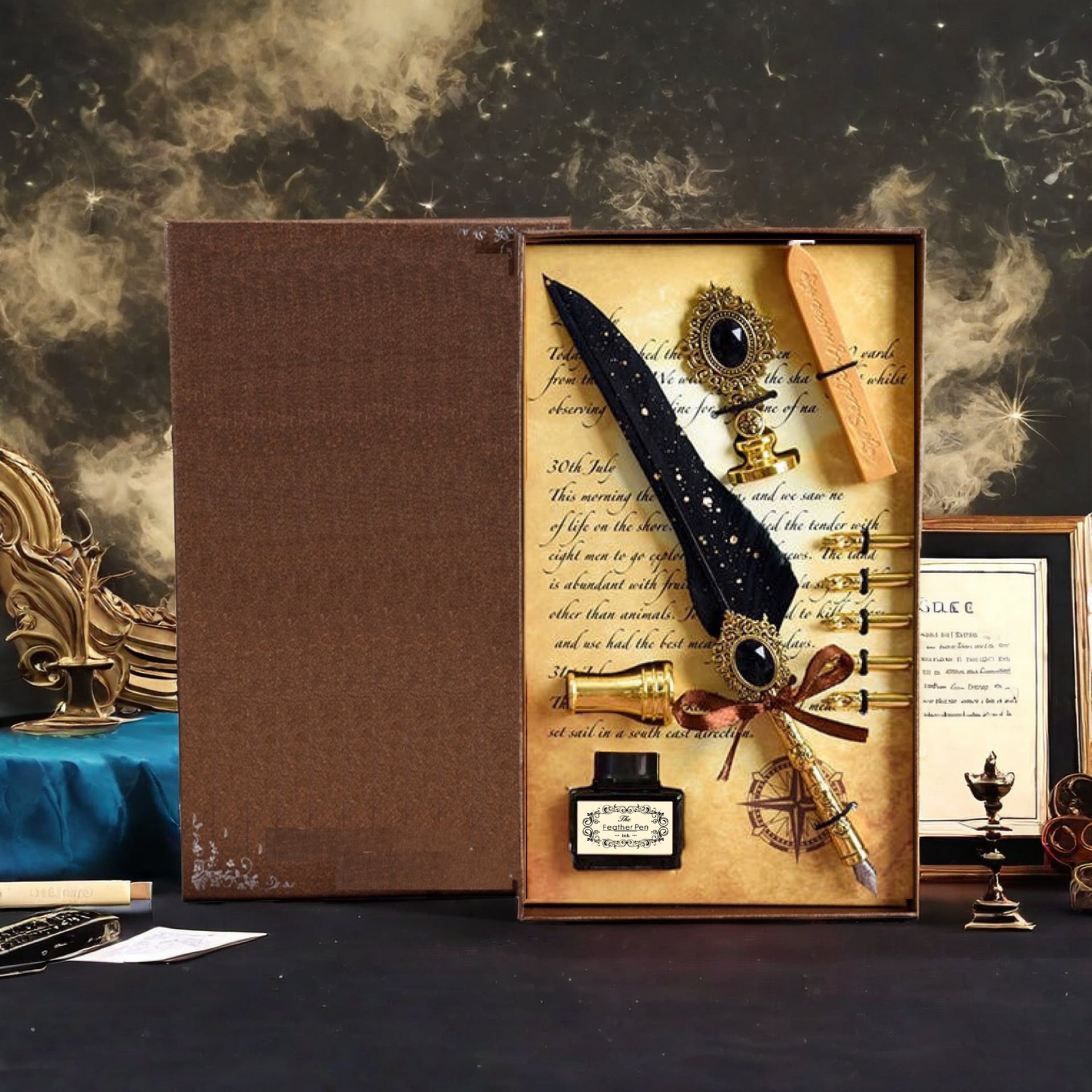 羽根ペン、替えペン先、インク、ペン立て、シーリングスタンプ、ハンドル、ロウソク
