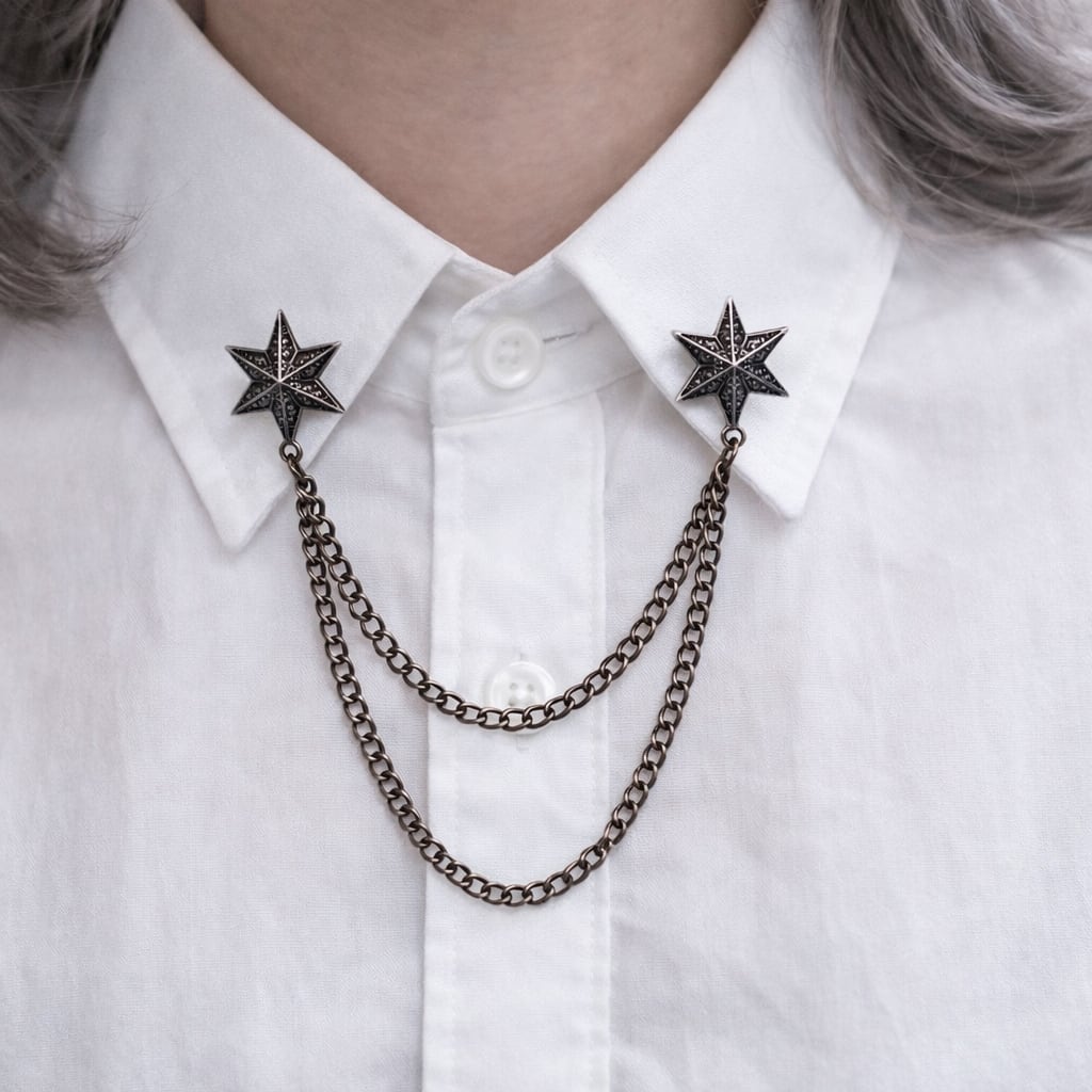 左右の襟先に留めるだけで、装いにさりげない華やかさと印象的な存在感をプラス。